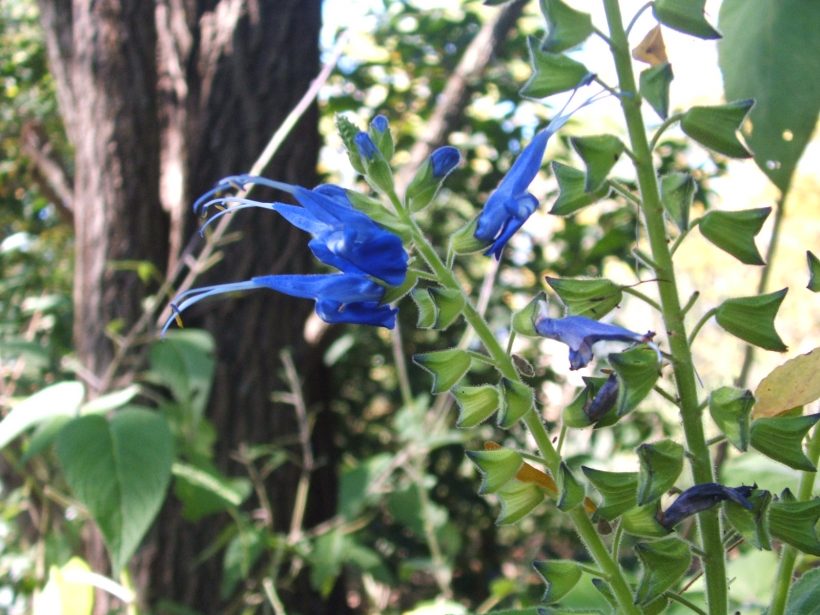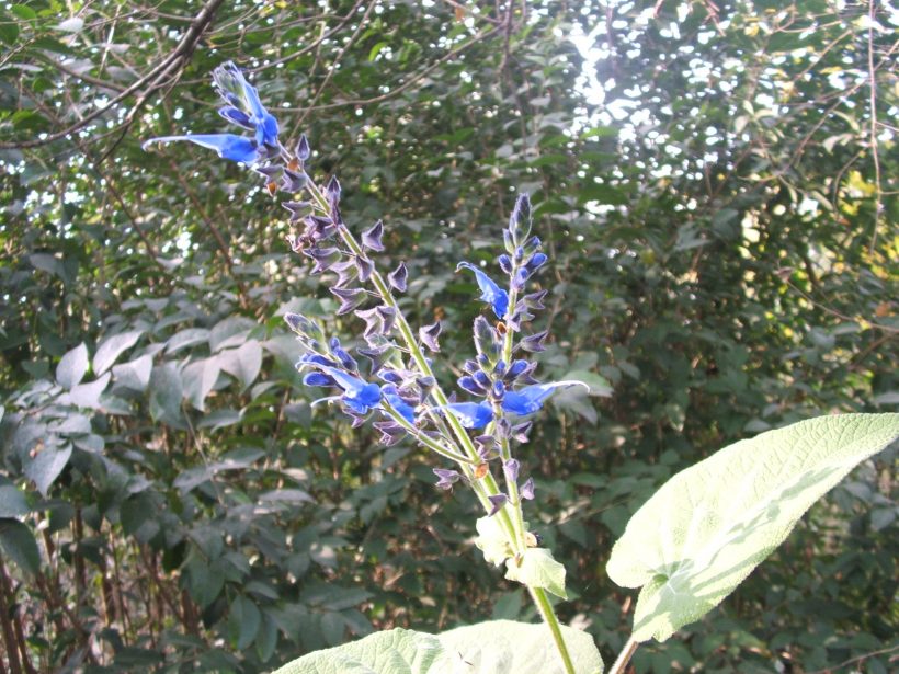Otra salvia exuberante peruana. La salvia macrophylla parece una planta de interior por la textura y densidad de sus enormes hojas. Prefiere la sombra, donde prospera hasta volverse enorme, y en verano corona su follaje con delicadas flores de un hermoso azul. No tolera heladas.
