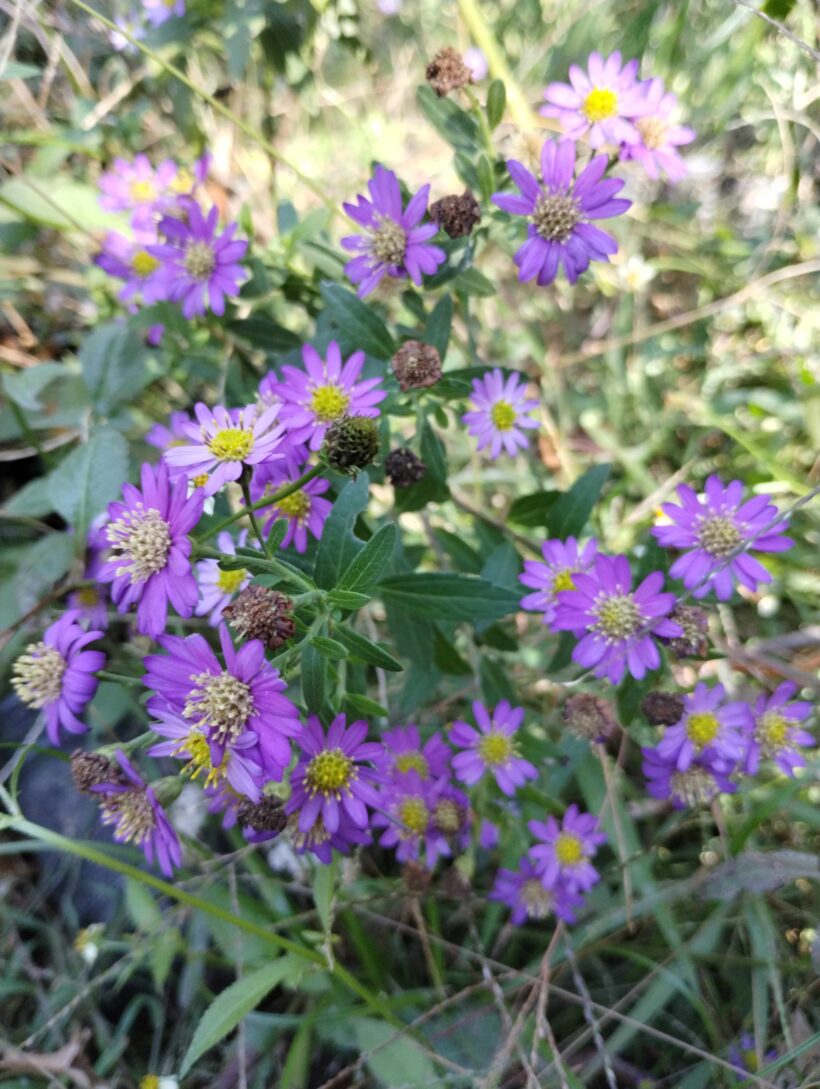 Uno de los asters de floración tardía, que florece una sola vez en mayo, pero brinda manchones de color cuando no hay demasiado. se extiende por estolones, y en lugares con riego puede ser agresivo. en el cultivo tenemos dos cultivares, uno más celeste y otro púrpura.