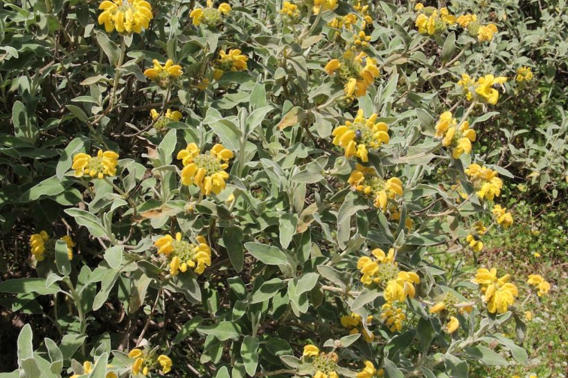 Le dicen salvia de Jerusalem, pero de salvia no tiene nada, aunque si nos falta amarillo el phlomis es una adición espectacular para el jardín. Arbusto de excelente estructura y porte, que puede llegar al metro de alto por metro y medio de ancho, con hojas agrisadas. En invierno se seca para rebrotar en primavera. Pleno sol y poco o nada de riego.