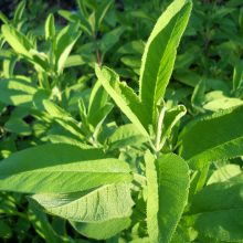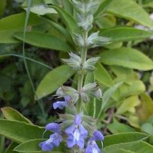 La salvia somalensis nativa de las montañas de Somalía tiene un follaje distintivo, verde, con un perfume picante, y florece en verano con largas varas celestes.