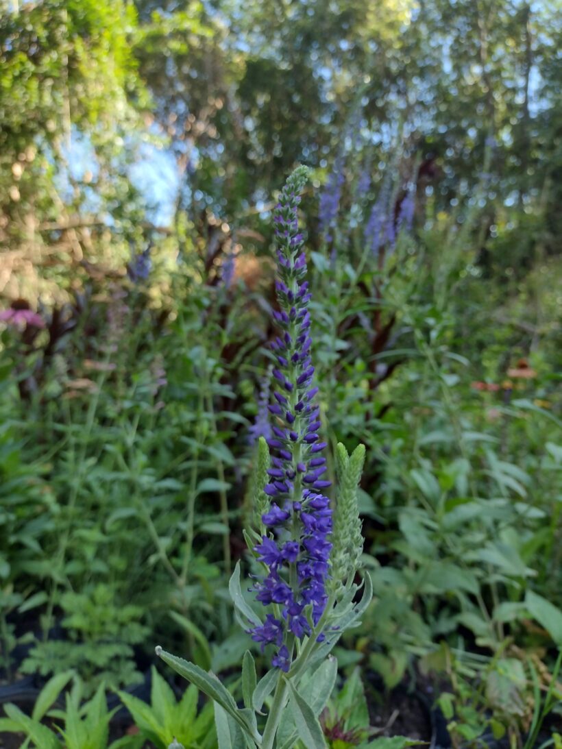 la verónica spicata tiene flores en formas de vara, delicadísimas, en un azul increíble. una herbácea que desaparece en invierno para rebrotar en primavera, que agradece algo de sombra en verano.
